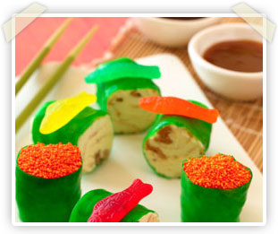 fruit roll snack. Arrange "sushi" on a plate and decorate cut sides with sprinkles.